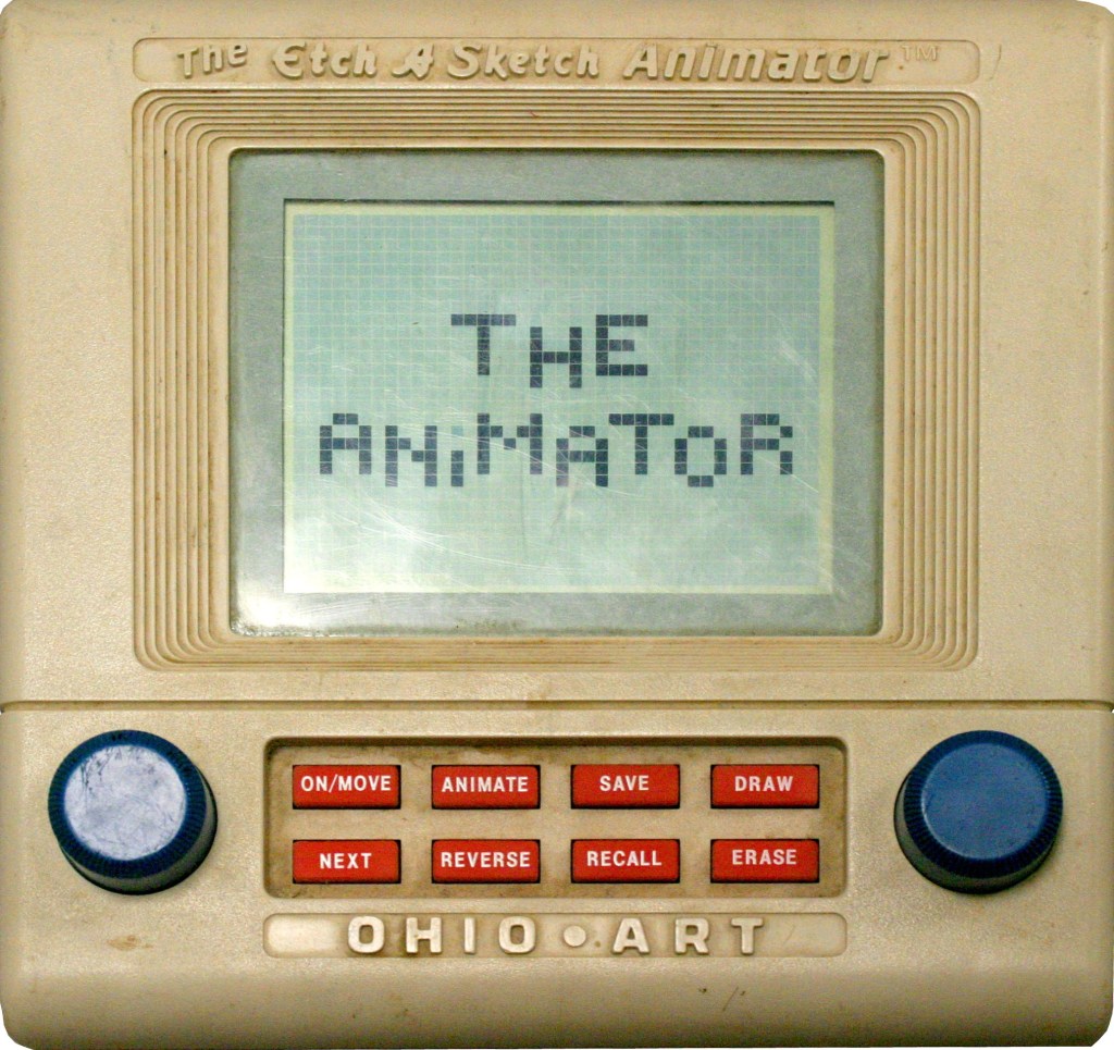 Like the Etch A Sketch, the Animator had the two knobs at the bottom that controlled the horizontal and the vertical. I can’t remember which was which. But they moved the little cursor on that screen that was slightly larger than that of a Game Boy.