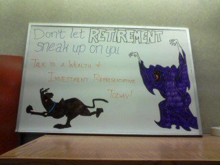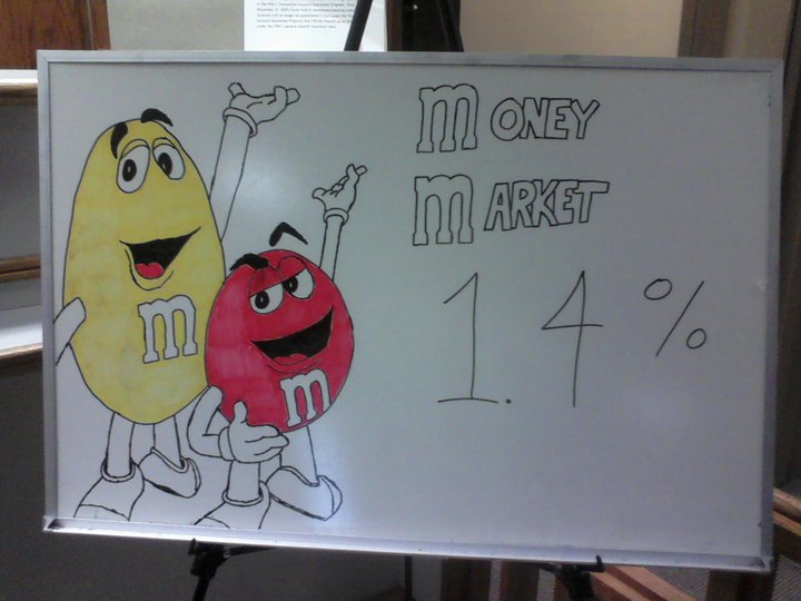 My second board wasn’t anything special. It just advertised a special CD rate that we had going on. I couldn’t think of anything clever to draw with that one, just a bunch of dollar signs and some arrows denoting the passage of time. Really not special.