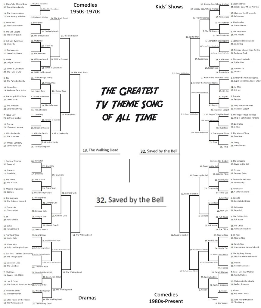 But as I came up with shows to include, it became clear that it was impossible to narrow it down to only 16 shows per category. It turned out, even expanding the bracket to 32 per category, I still managed to leave out some classic TV show theme songs (Who’s the Boss?, Captain Planet, etc.).