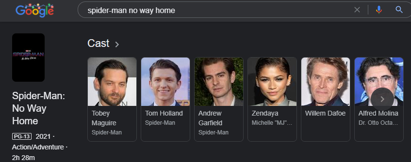 Now we come to the big appearances that Sony and Marvel tried to keep a secret but… really? Did they keep it secret? I mean… When you Google Spider-Man: No Way Home, this is what shows up…