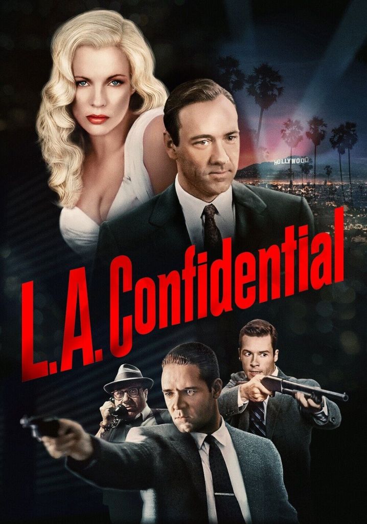 In the dimly lit alleys and glitzy glamour of 1950s Los Angeles, where moral lines blur and corruption festers like an insidious disease, Curtis Hanson’s neo-noir masterpiece, L.A. Confidential, unfolds with the finesse of a virtuoso. This film is a seductive and gritty exploration of crime, power, and redemption, set against a backdrop of Hollywood’s allure and the underbelly of police work. With a stellar ensemble cast featuring Kevin Spacey, Russell Crowe, Guy Pearce, Kim Basinger, and Danny DeVito, L.A. Confidential is a cinematic triumph that continues to captivate audiences, even decades after its release.